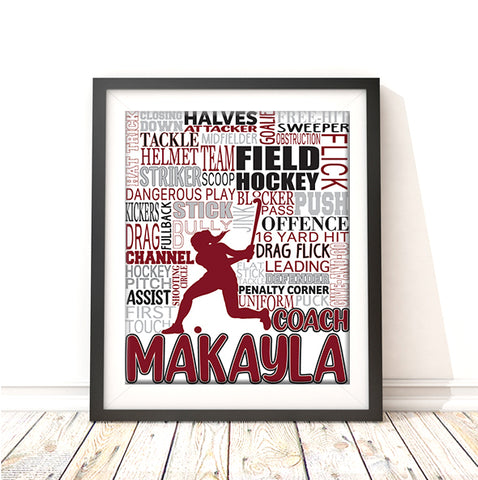 Poster for field hockey players of all ages. A unique custom gift for a team or coach. Personalize this print with team colors, team name and a player's number. Bulk discounts given.
